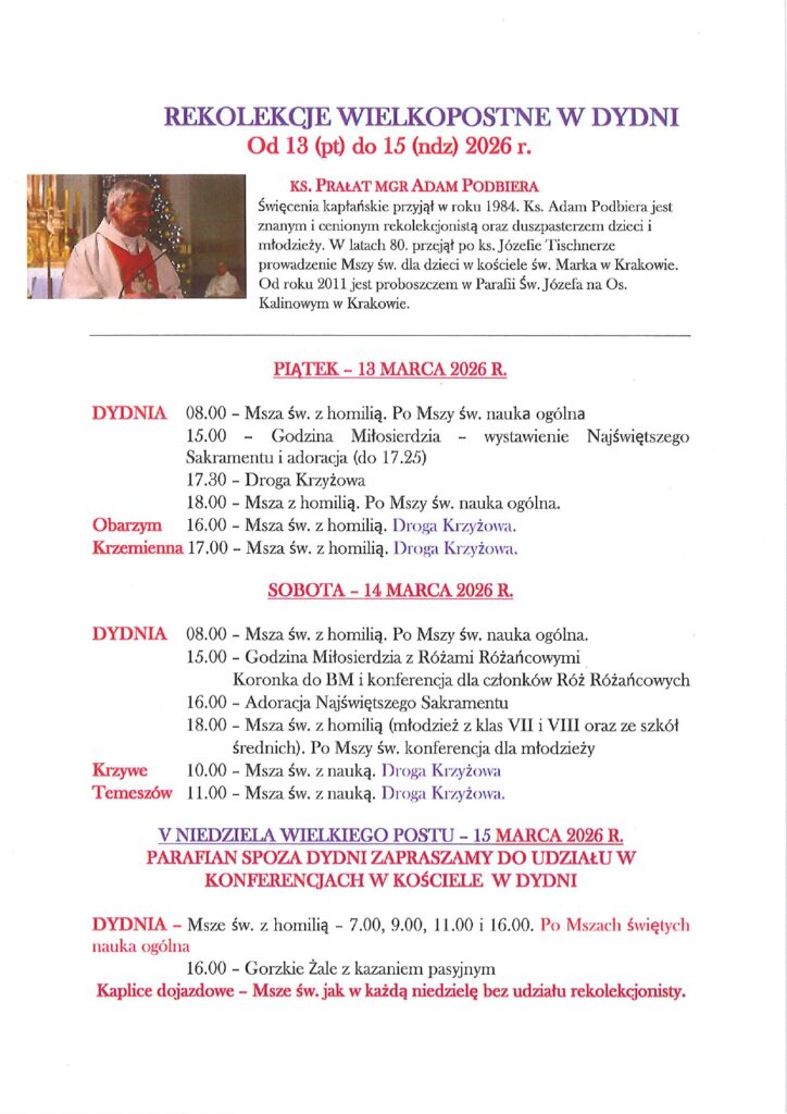 - w Dydni – Droga Krzyżowa w każdy piątek o g. 17.30, natomiast Gorzkie Żale z kazaniem pasyjnym w niedzielę o g. 16.00.
