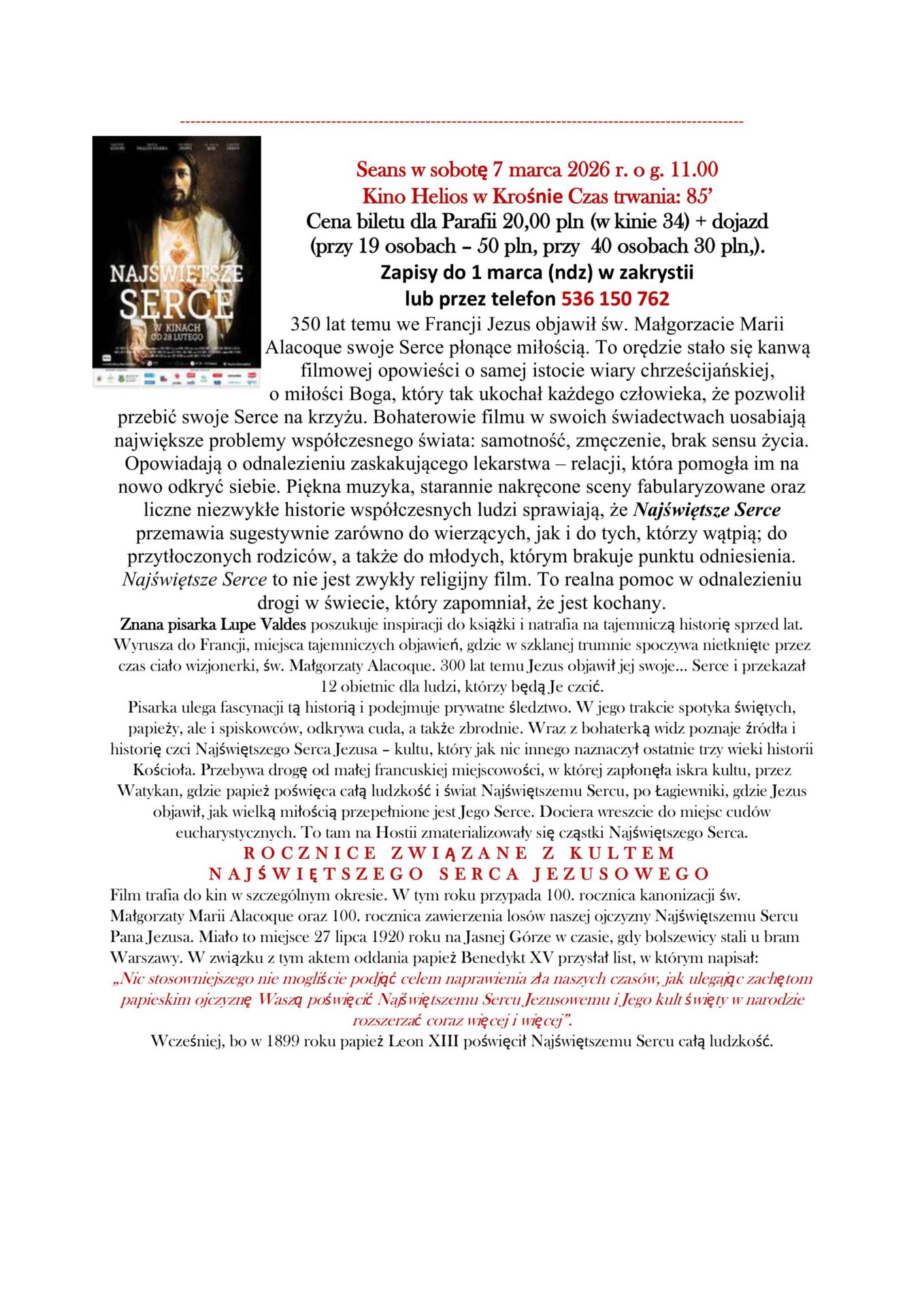 - Od 20 lutego do polskich kin wchodzi poruszający francuski film religijny Najświętsze Serce, który w ostatnich tygodniach niespodziewanie wstrząsnął Francją i stał się dla tysięcy ludzi impulsem do duchowego przebudzenia. Widząc niezwykły wpływ tego dzieła na widzów, próbowano nawet zakazywać projekcji czy reklamy filmu. Gorąco zachęcamy, aby wybrać się do kina, zobaczyć film, przeżyć i pozwolić, aby Serce Jezusa w okresie Wielkiego Postu zadziałało także w naszym życiu. Seans dla naszej parafii jest zaplanowany na 7 marca (sobota) na g. 11.00 w Kinie HELIOS w Krośnie. Zapisy w zakrystii do 2 marca z wpłatą 50 PLN (koszt filmu 20 pln). Wyjazd o g. 09.00 z parkingu przy kościele w Dydni. Przy 19 osobach koszt przejazdu 50 pln, natomiast przy 40 osobach koszt autokaru wyniesie 30 pln od osoby. W gazetce podano miejsce emisji filmu w Rzeszowie, ale ostatecznie będzie w kinie HELIOS w Krośnie